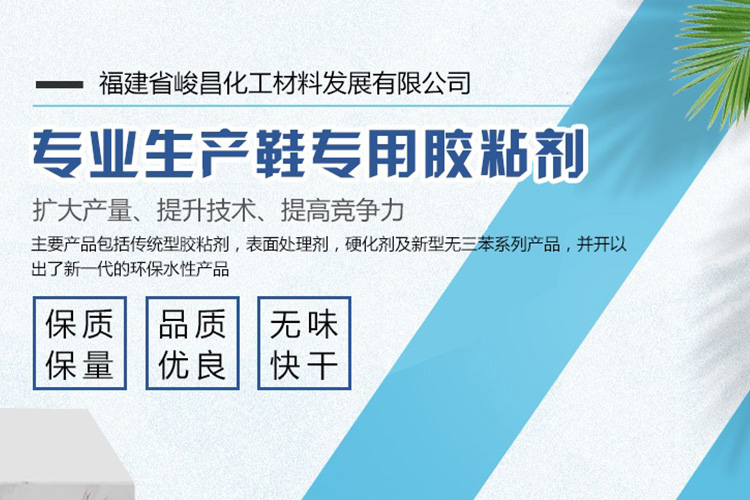 福建省峻昌化工材料發(fā)展有限公司總部設在中國鞋鄉(xiāng)——晉江。為更好、更方便服務廣大客戶,我司在廣東江門及福建均設有先進的PU膠生產基地,歡迎廣大同行前來我司灌裝或批發(fā)銷售。公司是一家中外合資,面向亞太地區(qū)從事研究,生產銷售鞋用粘膠10多年的專業(yè)公司。從國外引進生產能力為數萬噸的全套先進生產,檢驗設備,與德國Bayer,日本DENKA及美國,西班牙等其它海外公司有著密切的原材料及技術合作。公司主要產品包括傳統(tǒng)型膠粘劑,表面處理劑,硬化劑及新型無三苯系列產品,并開以出了新一代的環(huán)保水性產品。供應國內外鞋業(yè),手提箱包及建筑工程單位使用。公司始終保持產品的良好品質及專業(yè)特性,并倍受廣大客戶好評。